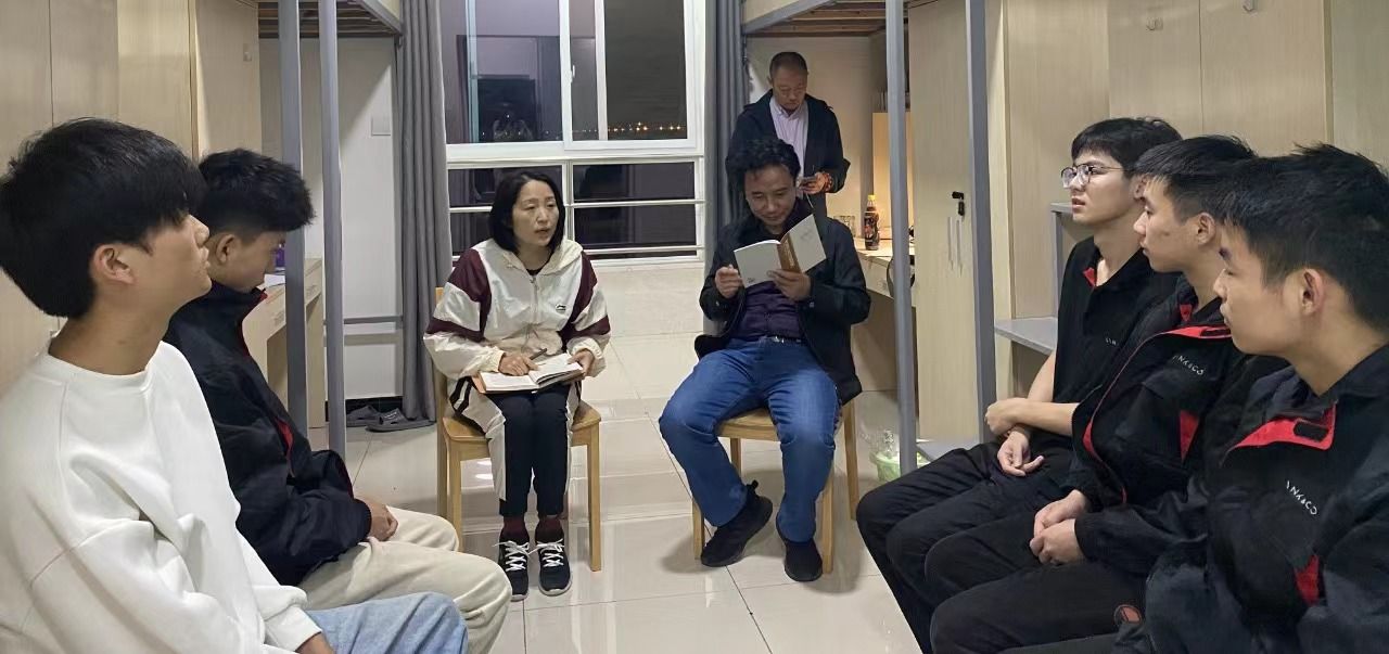 2023年10月24 日智造学院开展吉利实习工厂宿舍团建活动。公司党总支书记曹选平,党总支副书记兼团总支书记李敏和专职辅导员尚丽华老师去往吉利工厂看望大三实习同学。