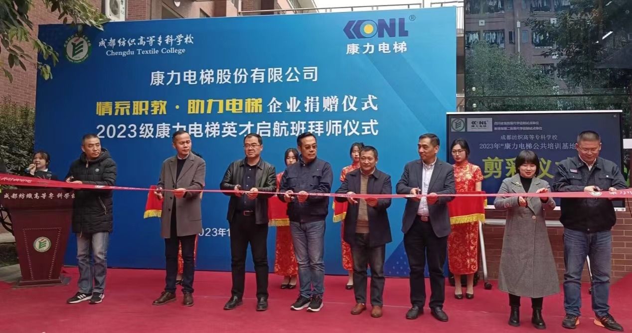 在捐赠仪式上,双方领导互赠了捐赠牌,这是责任的传递,是辉煌的见证。标志着我方合作迈向新的征程,期待我们未来能够携手共赢,互利共生!随后康力总经理张忠、副总经理李冬竹、副总经理顾方圆;成都纺织专科高等学校董事长孙锐、局长蔡昌林、秘书长闫光建、副董事长李明富、交流处处长童晓晖为“康力电梯公共培训基地”正式落地进行剪彩。