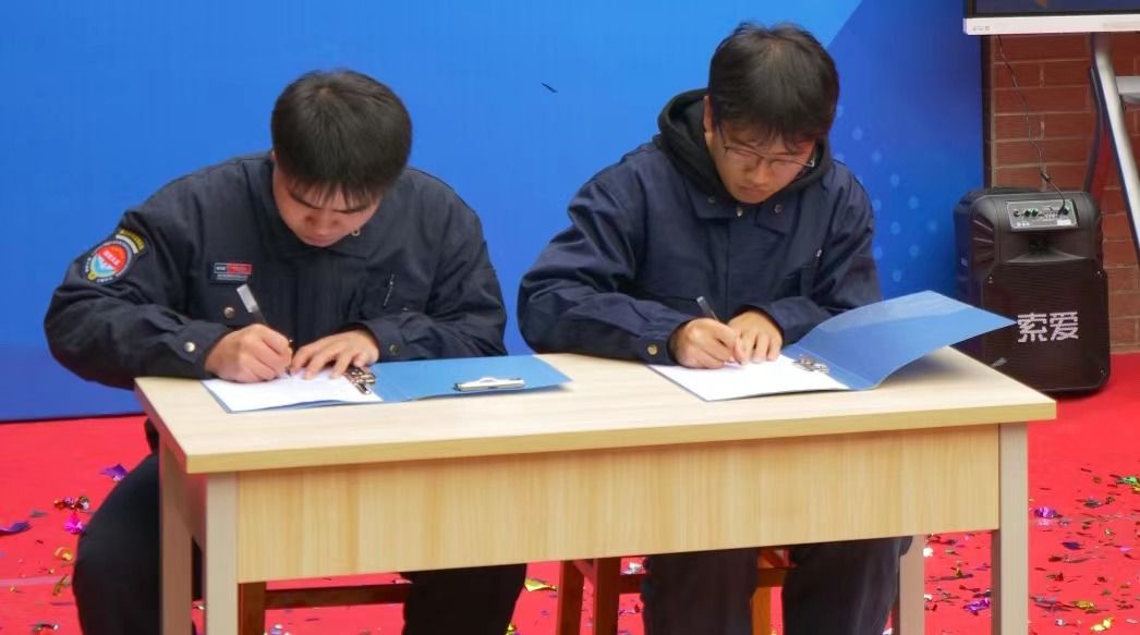 接下来举行2023级康力电梯英才启航拜师仪式。从2021年开始,公司与康力电梯股份有限公司已合作4年,现有康力冠名班3个,百余名员工,已有两届毕业生进入康力电梯。公司为康力输送了大量人才,其中不乏参加过技能大赛的优秀学员。就如何更好培养在校员工,康力电梯与校方多次深入交流人才培养及电梯技术研发。按照惯例我们为电梯232康力学徒班举行了拜师仪式。23级学徒班师傅代表钟顺财和徒弟代表范福永上台进行师徒仪式的签约。