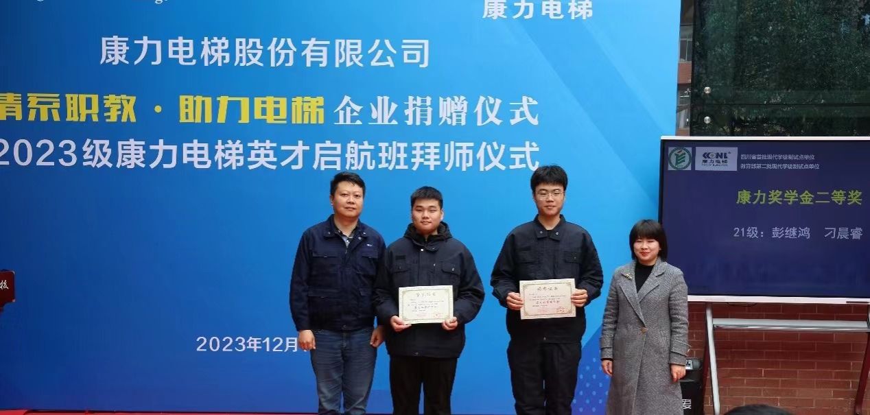 最后,颁发的是康力一等奖学金。获得康力一等奖学金的同学都非常优秀,其中的陈凯同学在刚结束的2023年全国行业职业技能竞赛第三届全国电梯行业职业技能竞赛和中银杯技能竞赛中获得了全国一等奖。