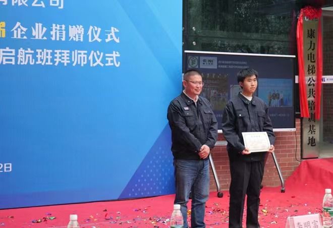 康力电梯为每一个康力学徒班配套了一对一的师傅为他们三年来至以后的实习工作提供帮助。集团和康力领导分别为师傅们,辅导员,导学老师颁发聘书,承接师生的关系,承接企业的文化。