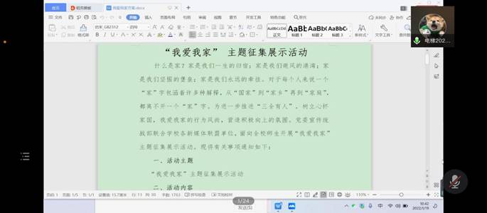 本次会议于1月19日上午召开,由辅导员周玲老师主持,公司党总支副书记兼团总支书记李敏主讲。本次会议围绕“我爱我家”主题征集活动展开,先是阐述本次活动的主题,然后提出作品的五个选择方向: