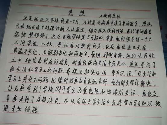 大家走后,赵吉林同学特意写了一封“入校的感动”,表达他对于学校及学院关怀的感谢,他很庆幸自己来到成都纺专这个大家庭,并表示自己今后会积极向上,努力学习,提升专业技能,不负青春,不负韶华。