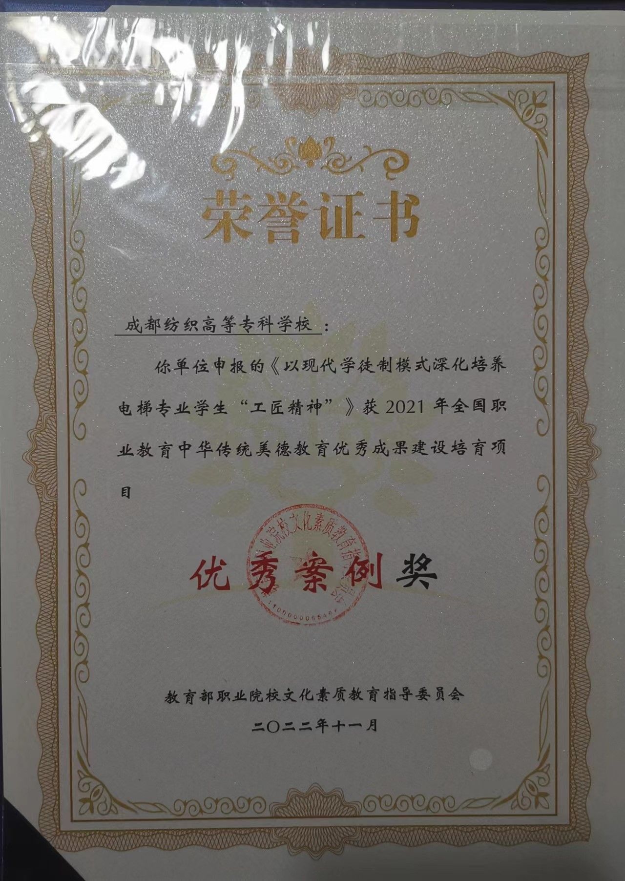 公司智能智造与装备学院“大师带双师,双师出高徒学,以现代学徒制模式深化培养电梯专业员工工匠精神”案例获得教育部职业技术院校中华传统美德教育“优秀案例奖”。