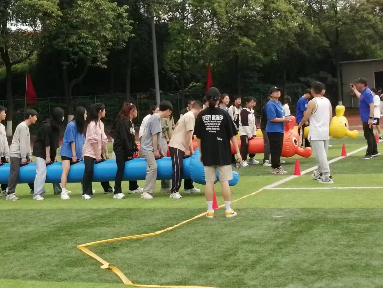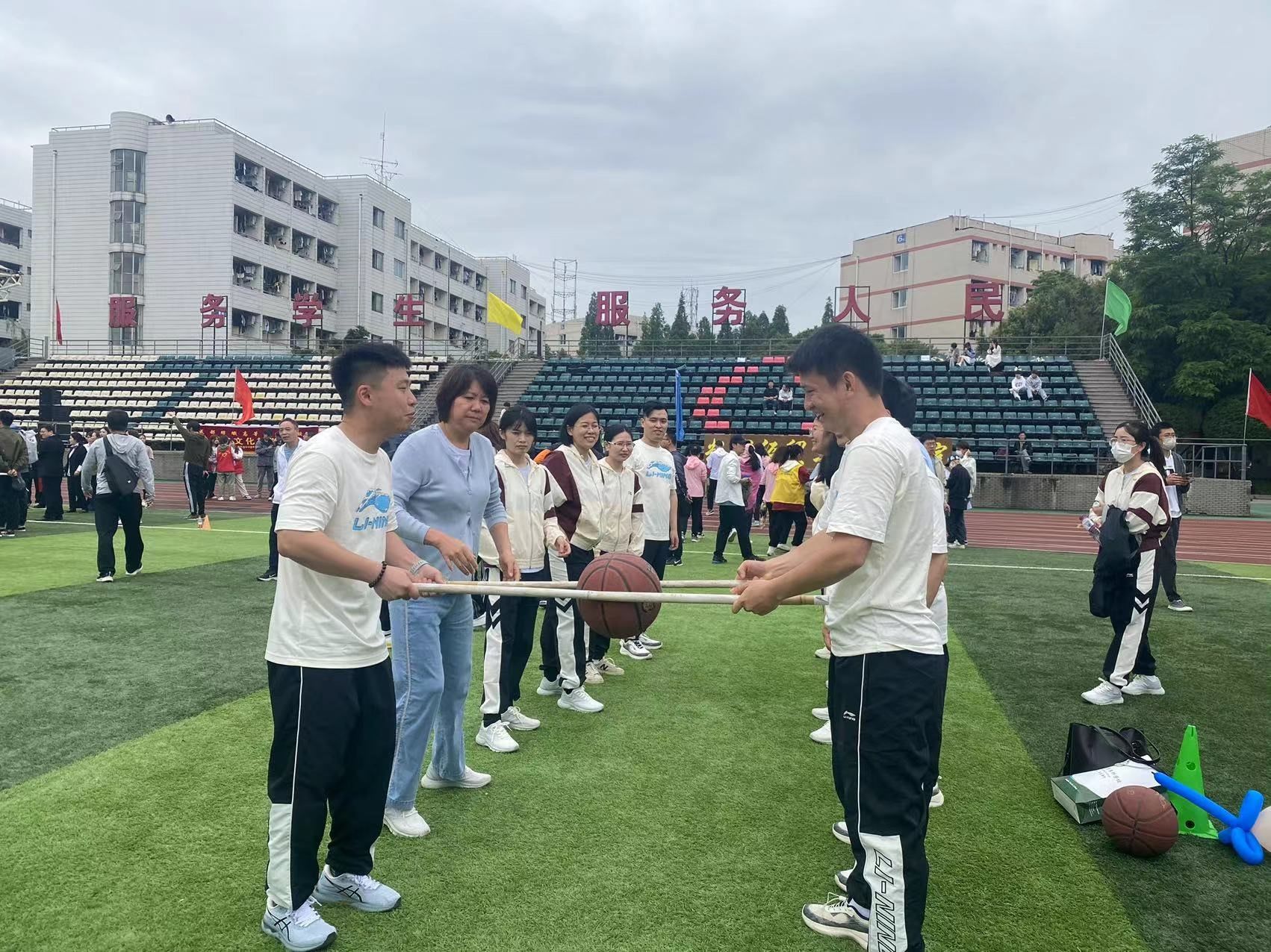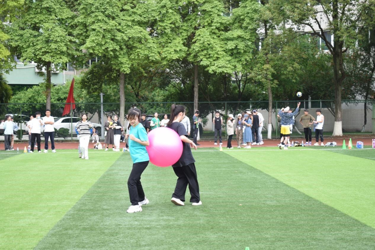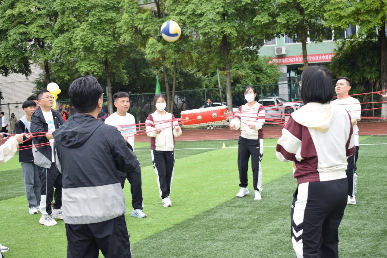 教职工趣味运动学院的老师们都努力的拼搏,在背篓绣球、同心鼓、竹竿运球等项目上每个老师都表现出了与平时上课不一样的激情与活力。最终,在同心鼓和竹竿运球两个项目获得第一、飞盘9宫格第二的好成绩。