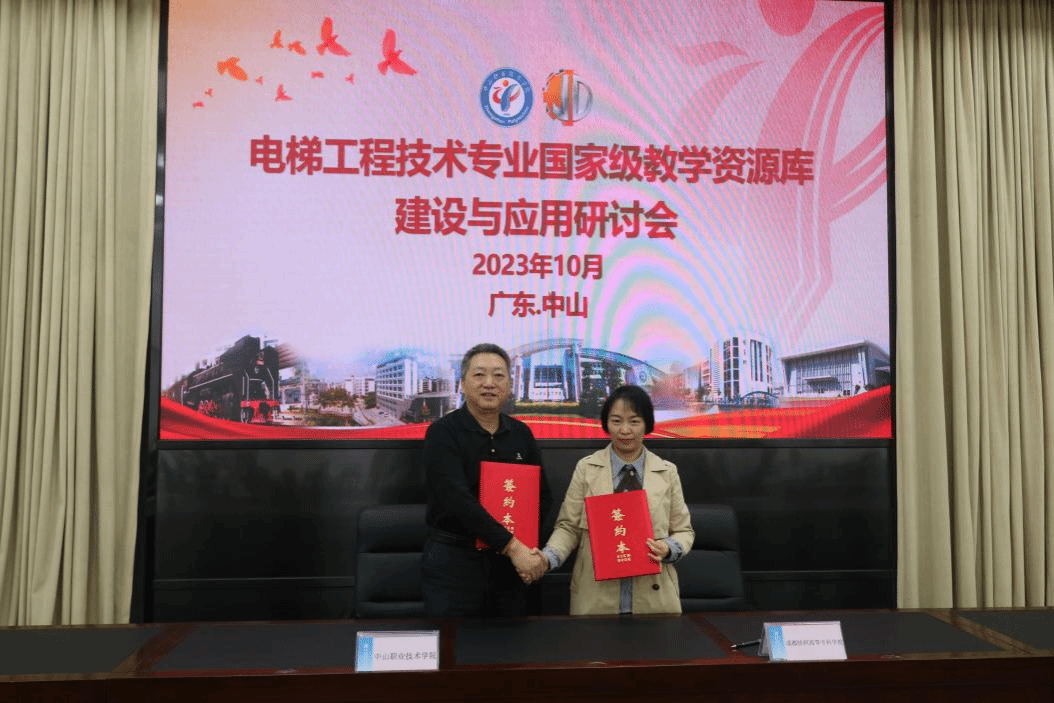 中山职业技术学院副董事长曹勇和电梯工程技术专业负责人朱霞签订资源库建设任务书